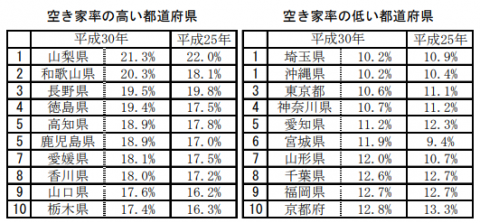 空き家率は山梨県が最も高く、埼玉県が最も低い
