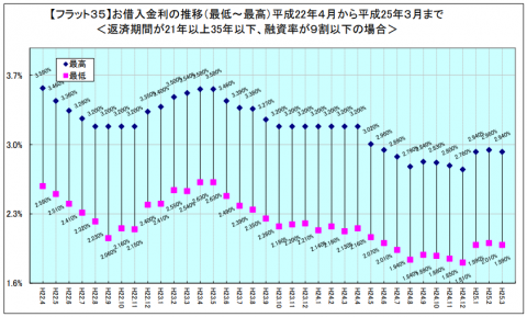 一方、上記のグラフは2010年~2013年のフラット35の金利推移を表したものです。2010年~2011年は2.5%前後で推移、2012年~2013年は2%前後で推移していたことがわかります。