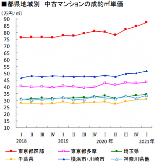 こちらは、首都圏都道府県別の中古マンション成約㎡単価の推移を表したものです。
