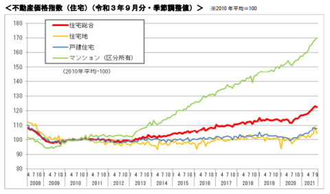 こちらのグラフは、2010年の価格を100としたときの住宅の価格指数の推移を表したものです。