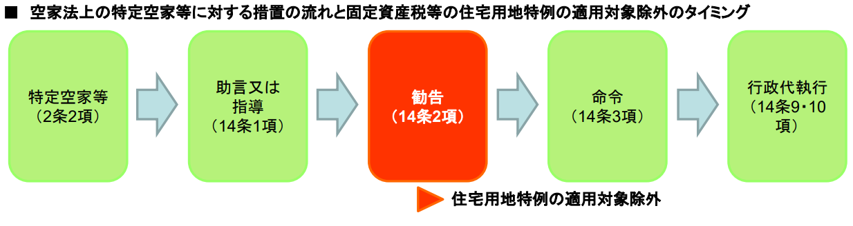 特定空き家に指定され、行政からの助言または指導に従わなかった場合は、勧告に。このタイミングで、空き家の建つ土地は「住宅用地の特例」の適用対象外となります。