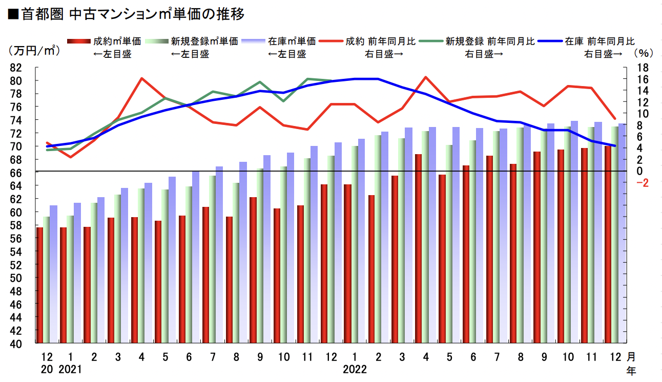 一方で、上記グラフは首都圏中古マンションの成約平米単価の推移を表しています。平米単価を示す赤線が、前年比を大きく上回って推移していることがわかります。東京都区部を除き成約件数を減らしている中、価格は高騰している……つまり、これが「弱いところが売れなくなり、強いところはまだまだ取引が活発であることを示している」のだといいます。