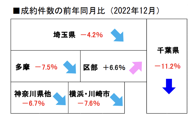 こちらは、首都圏中古マンション成約件数の前年同月比を表したものです。ご覧の通り、東京都区部を除く全てのエリアで成約数が減少していることがわかります。