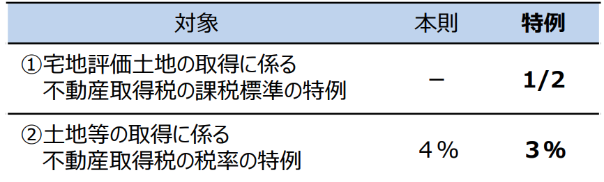 不動産取得税は、その名の通り不動産の取得に対して課される税金です。不動産のうち、土地の取得に係る課税標準額および税率は上記の通り軽減されます。同特例もまた2024年3月末までとされていましたが、2027年3月31日まで延長されます。