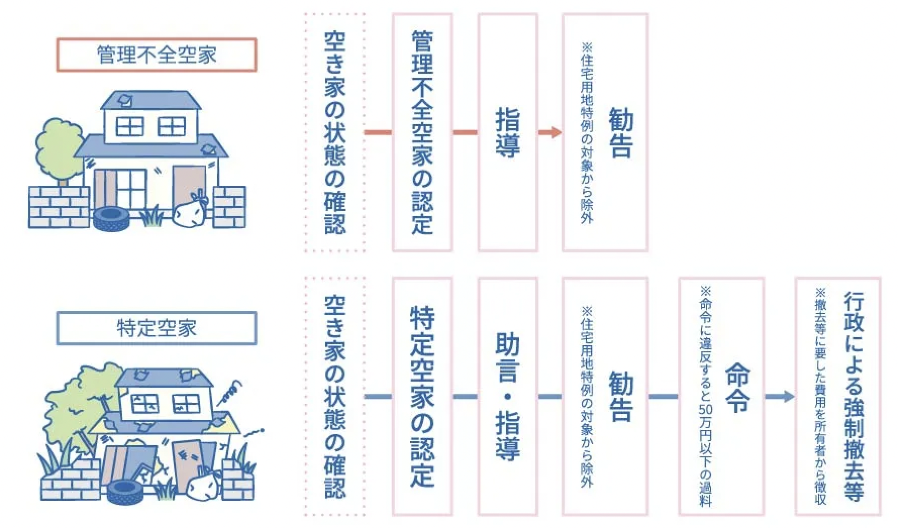 固定資産税が増税となる理由は、税額の軽減効果がある「住宅用地の特例」から適用除外となるからです。特定空き家や管理不全空き家に指定されたうえで勧告を受けると、固定資産税課税標準は最大6倍、都市計画税課税標準は最大3倍になります。